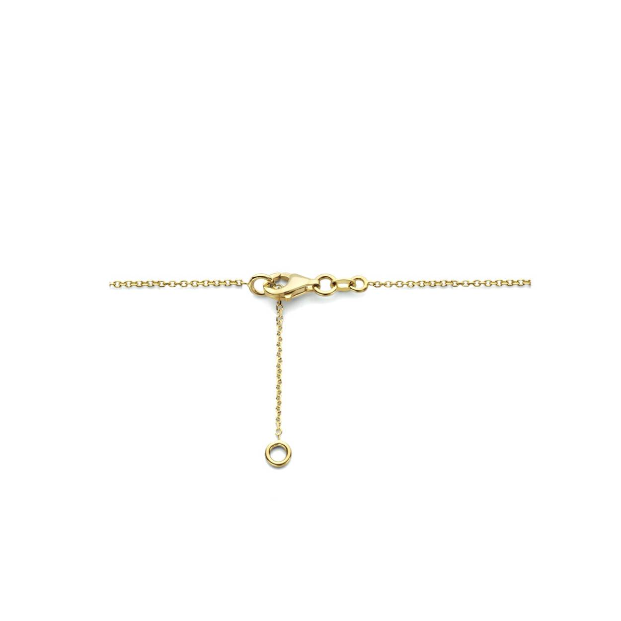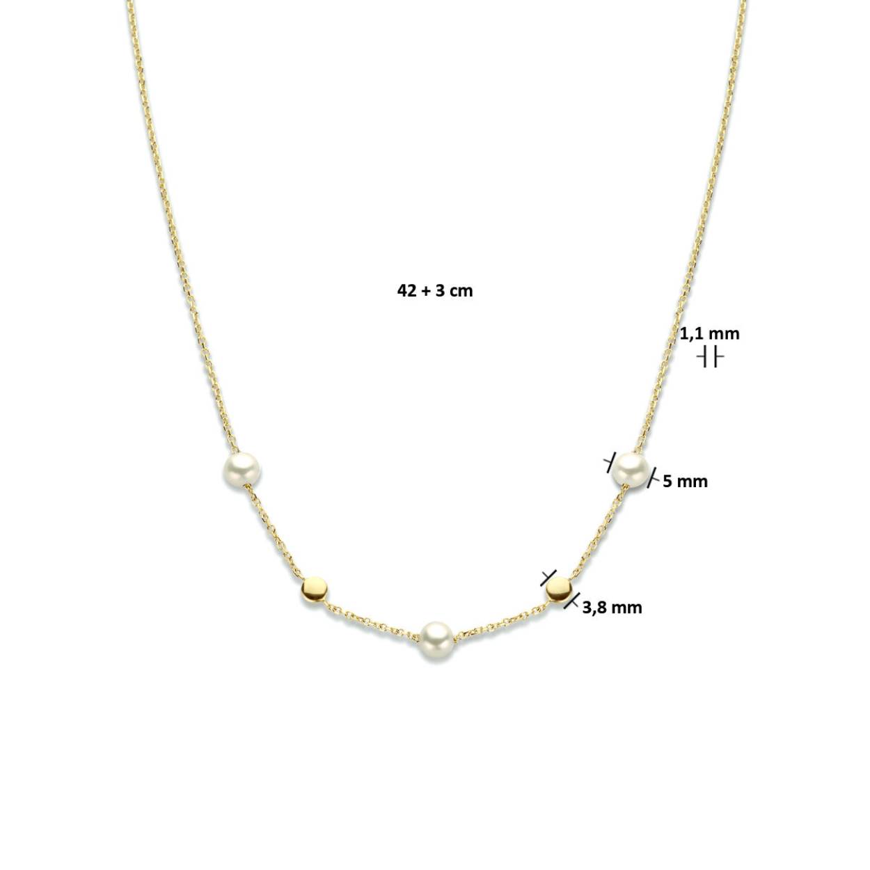 14k Geelgouden collier uitgevoerd met rondjes van 3.8mm en zoetwaterparels van 5mm. Het collier heeft een draaglengte van 42cm met een extensie van 3cm en een stevige karabijn sluiting.
