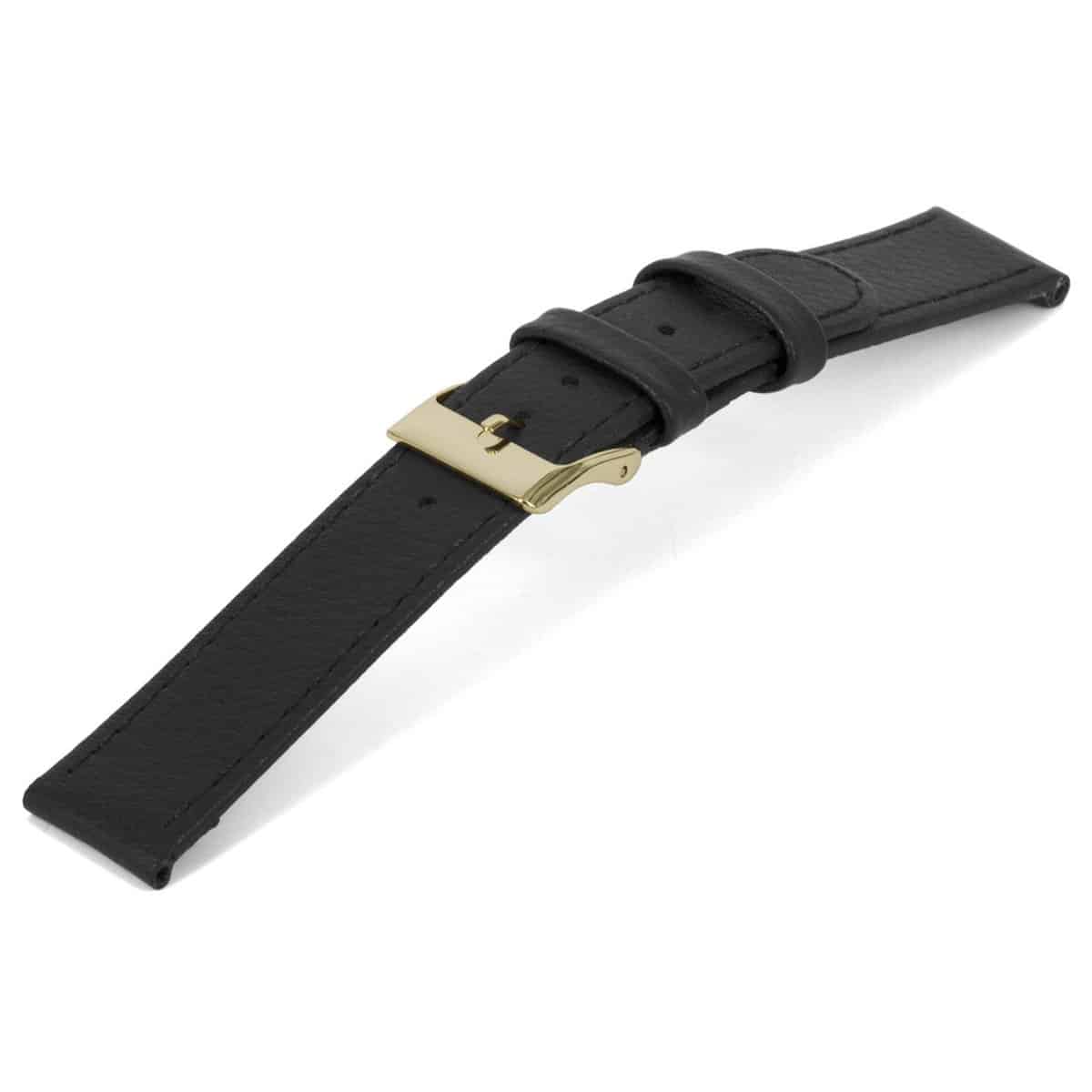 Zwart lederen horlogeband met goudkleurig edelstalen gesp.