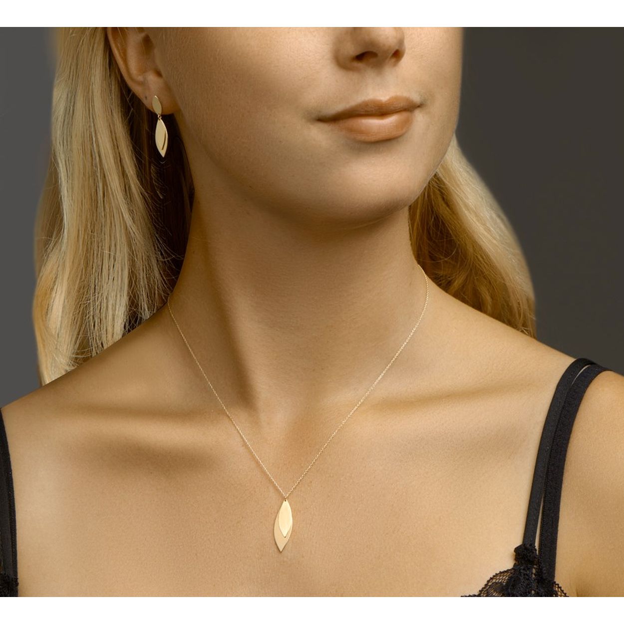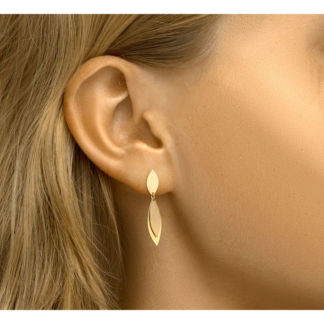 14k Geelgouden oorhangers met een totale hoogte van 3cm en een poli/matte afwerking. De hanger heeft een afmeting van 19x6.5mm.