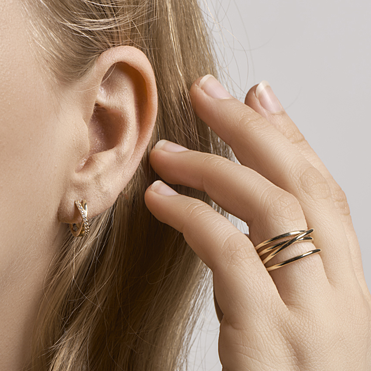Deze 14K geelgouden damesring is een gaaf alternatief voor de aanschuifring: er lijken vier ringen verwerkt door de verschillende banen die speels over elkaar lopen. De ring is op het breedste punt 8,5mm.