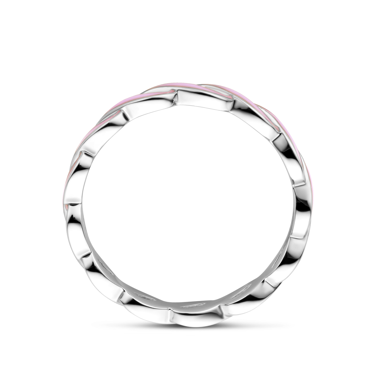 Gerhodineerd 925 zilveren ring uitgevoerd met roze emaille. De ring heeft een breedte van 3.5mm.