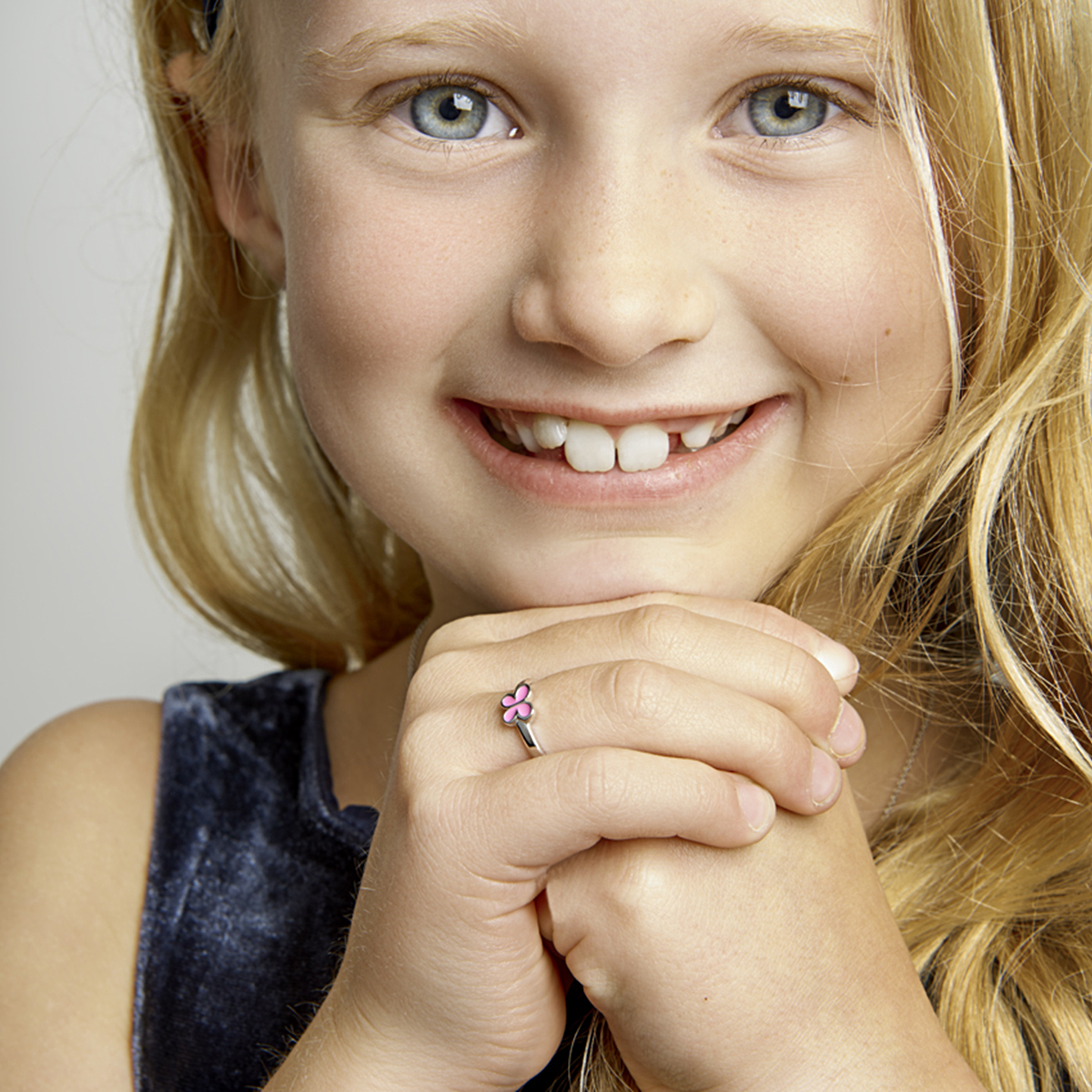 Beschrijving: Schattige gerhodineerd zilveren ring in de vorm van een vlinder uitgevoerd met roze emaille. Info: Gerhodineerd zilver is door de rhodiumlaag beter bestand tegen verkleuren en krassen.