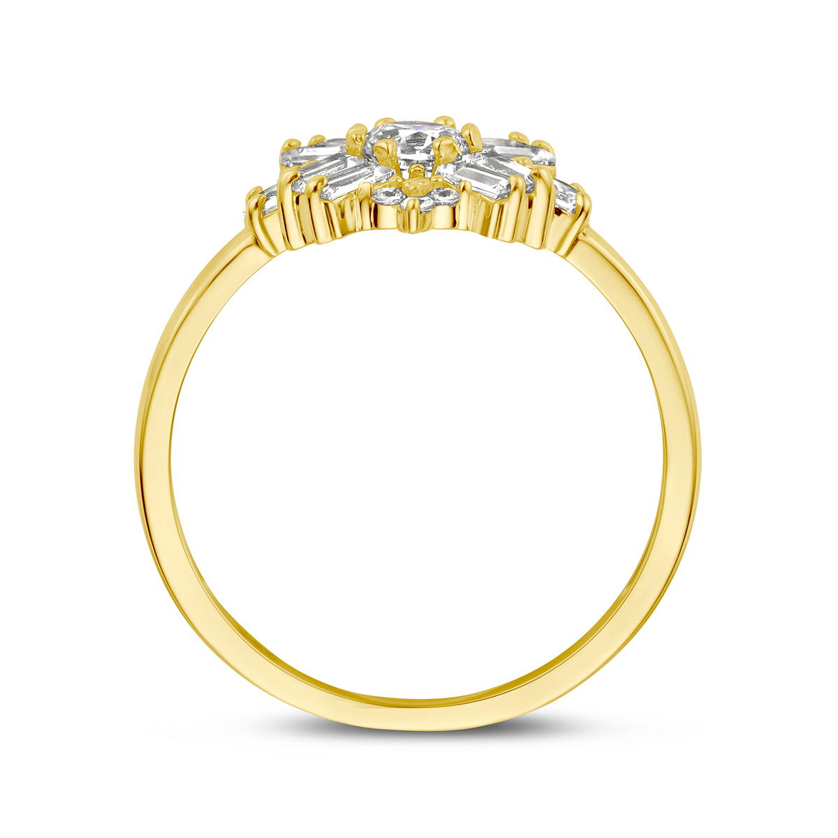 14k Geelgouden ring uitgevoerd met zirkonia. De ring heeft een breedte van 11.5mm.