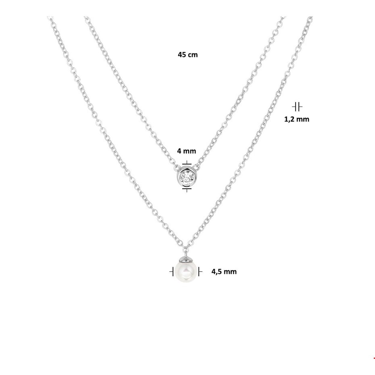 Beschrijving: Trendy gerhodineerd zilveren dubbel collier uitgevoerd met een synthetische parel van 4.5mm en een heldere zirkonia in een zetkast van 4mm. Het collier is voorzien van een stevige karabijn sluiting. Tip: Leuk om kado te geven! Zie je ze al stralen?