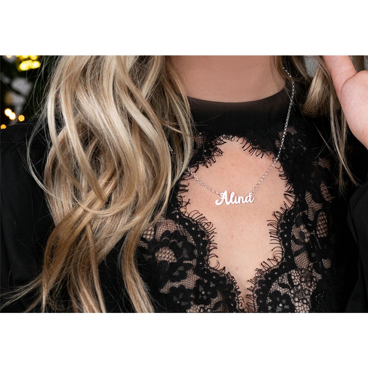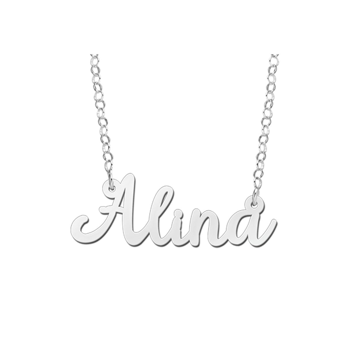 Er is niets leuker dan een gepersonaliseerde naamketting! Dit is onze naamketting: model Alina. Het collier is gemaakt van het eerste gehalte zilver, maar is ook leverbaar in goud. De naamhanger wordt standaard geleverd aan een massief zilveren jasseron collier van 42 cm lang.